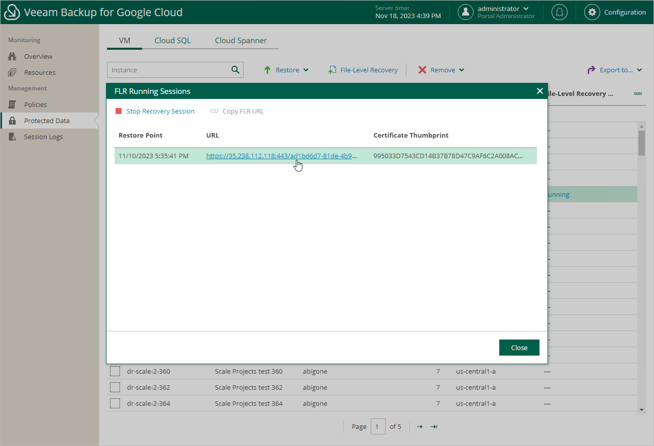 As soon as you click Finish, Veeam Backup for Google Cloud will close the File-level Recovery wizard, start a recovery session and display the FLR Running Sessions window. During the recovery session, Veeam Backup for Google Cloud will deploy a worker instance and attach persistent disks of the processed VM instance to it.