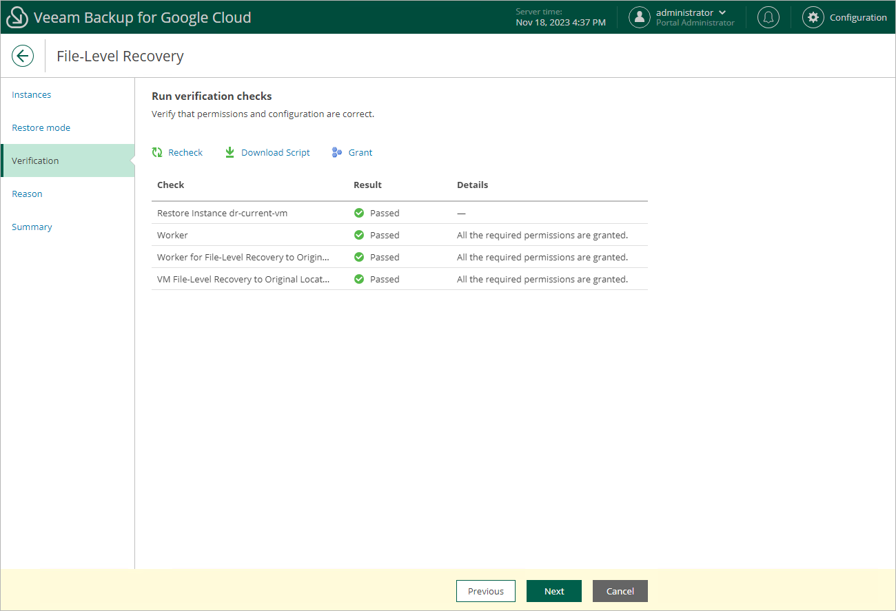 At the Verification step of the wizard, Veeam Backup for Google Cloud will verify whether restore settings are configured properly and the specified service account has all the necessary permissions required to perform recovery tasks for the target instance. For more information on the required permissions, see Service Account Permissions.