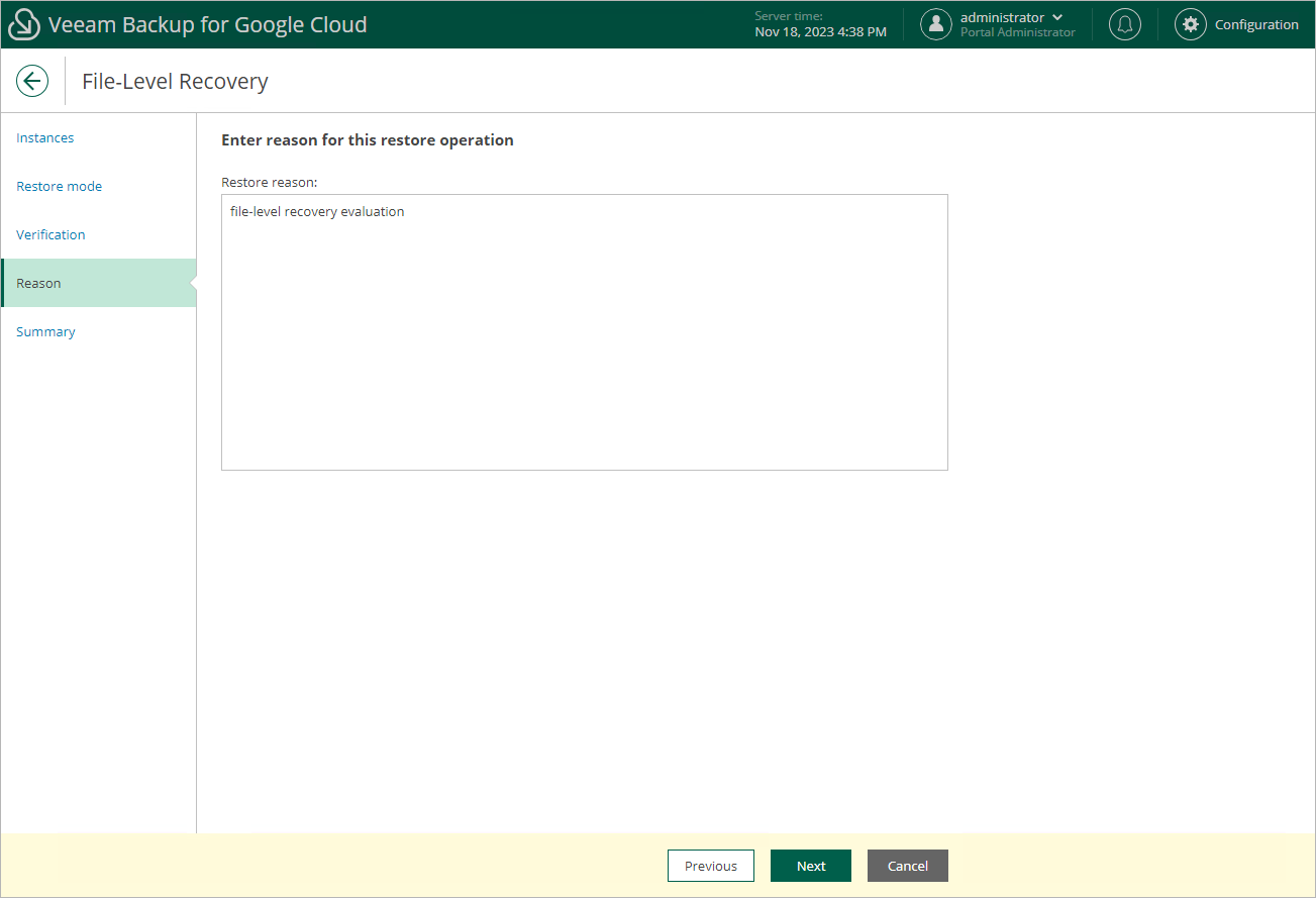 At the Reason step of the wizard, specify a reason for recovering files and folders. This information will be saved to the session history, and you will be able to reference it later.