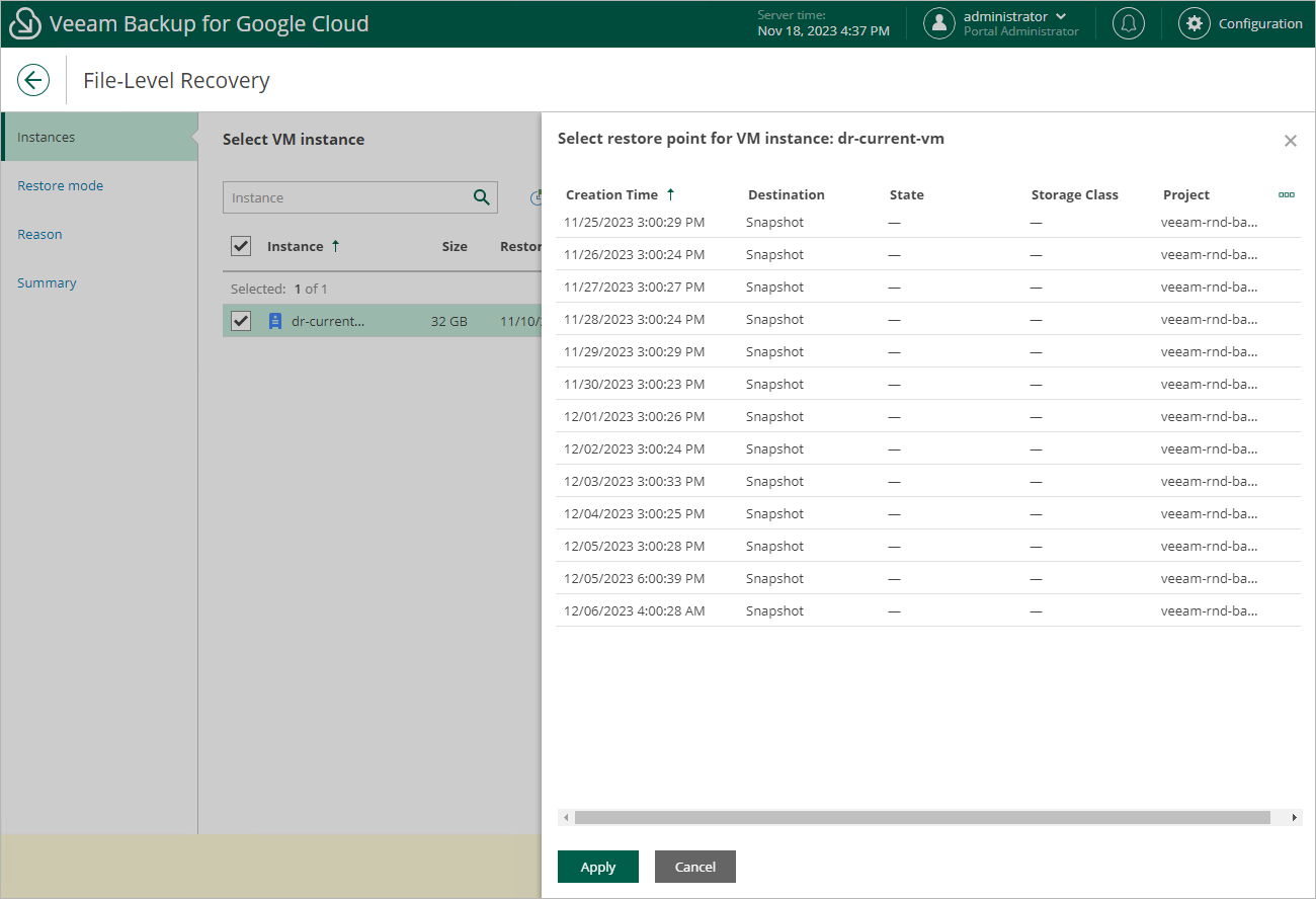 At the Instances step of the wizard, select a restore point that will be used to recover files and folders of the selected VM instance. By default, Veeam Backup for Google Cloud uses the most recent restore point. However, you can recover the items to an earlier state.