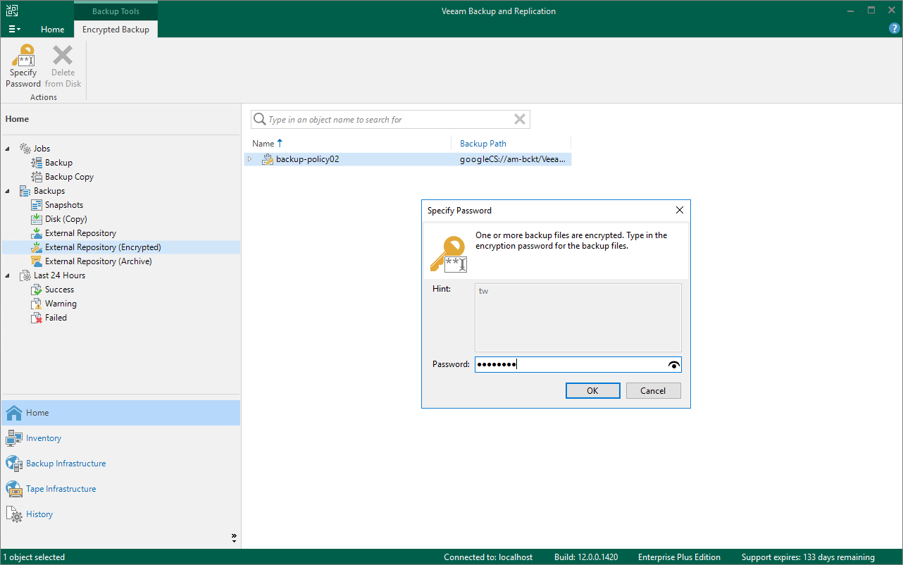 - Expand the backup policy that protects a VM instance whose image-level backups you want to decrypt, and select the backup chain that belongs to the instance. Click Specify Password on the ribbon.