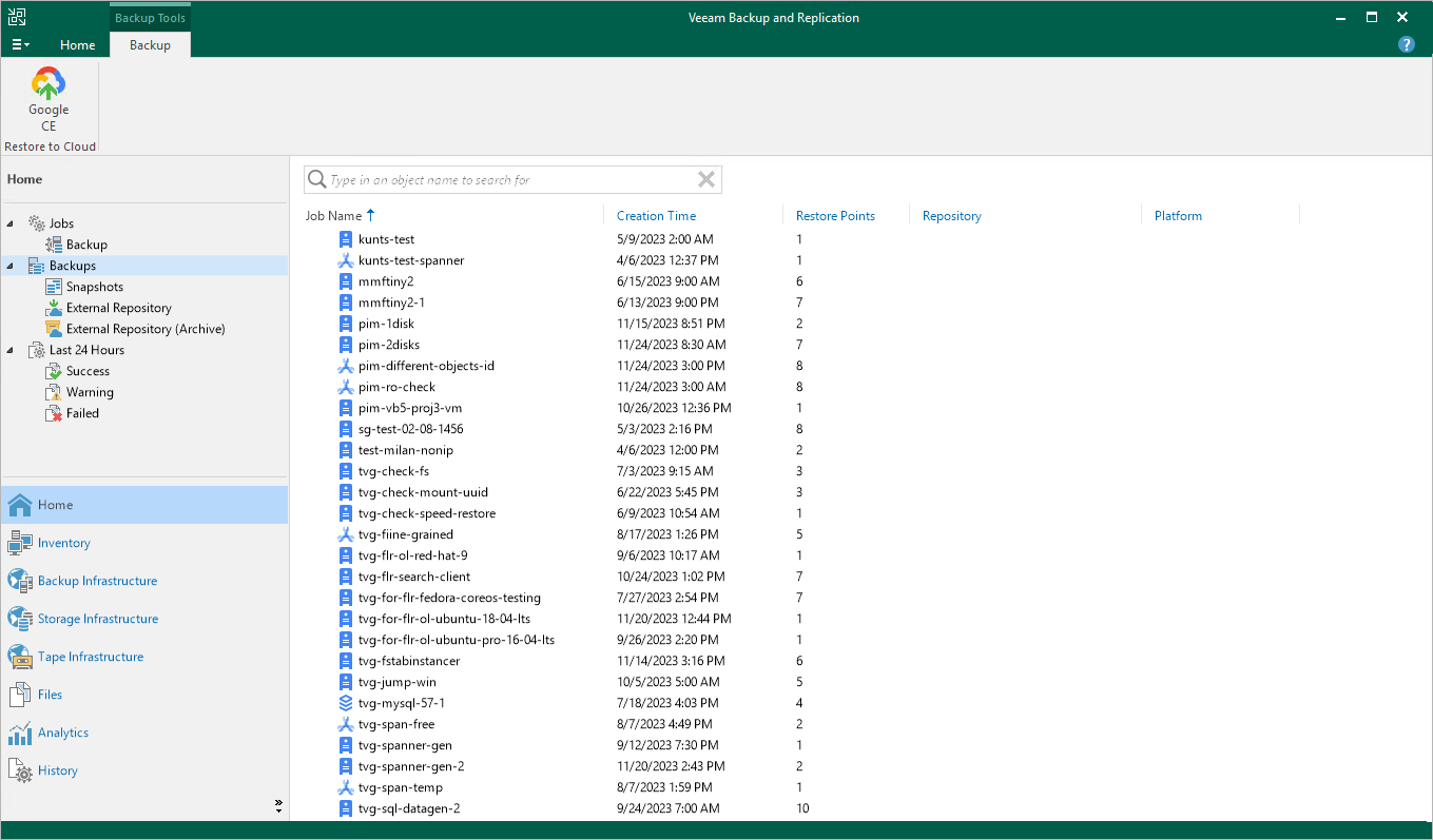 To view and manage backed-up data, navigate to the Backups node of the Home view. The node displays information on all restore points created by backup appliances.