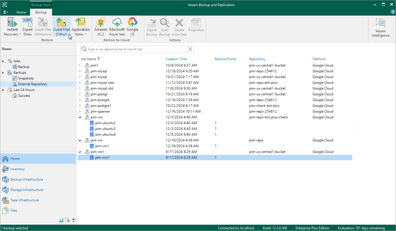 - Expand the backup policy that protects a VM instance whose files and folders you want to restore, select the necessary instance and click Guest Files (Other) on the ribbon.
