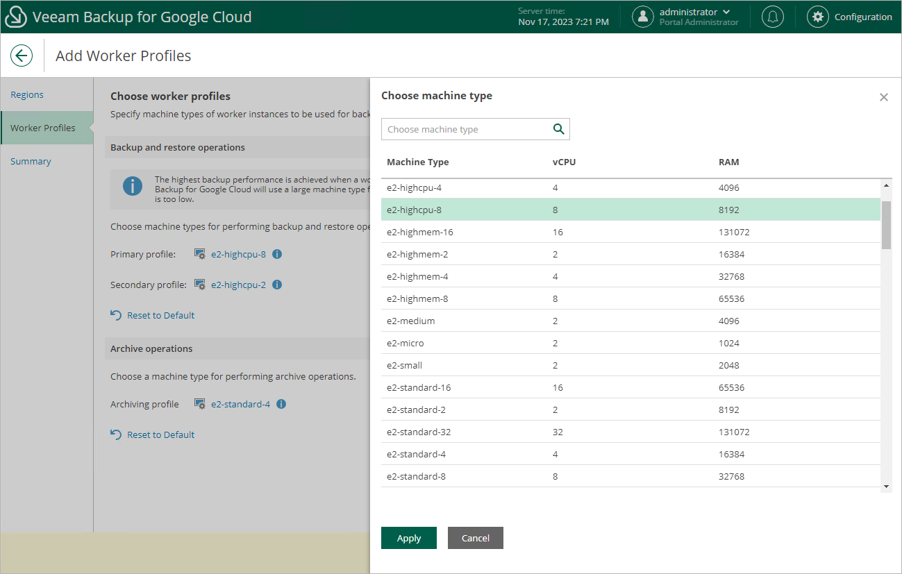 At the Worker Profiles step of the wizard, choose profiles that will be used to deploy workers in the selected regions. To help you choose, tables in the Choose machine type sections will provide information on the number of vCPU cores and the amount of system RAM for each available machine type.