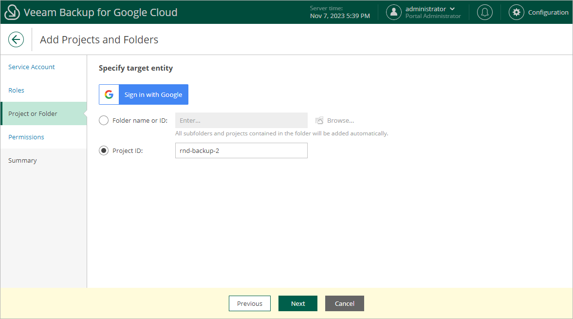 At the Project or Folder step of the wizard, specify the ID of a project or folder that manages the resources that you want to protect. If you choose a folder, Veeam Backup for Google Cloud will be able to access all resources in all projects that belong to this folder.