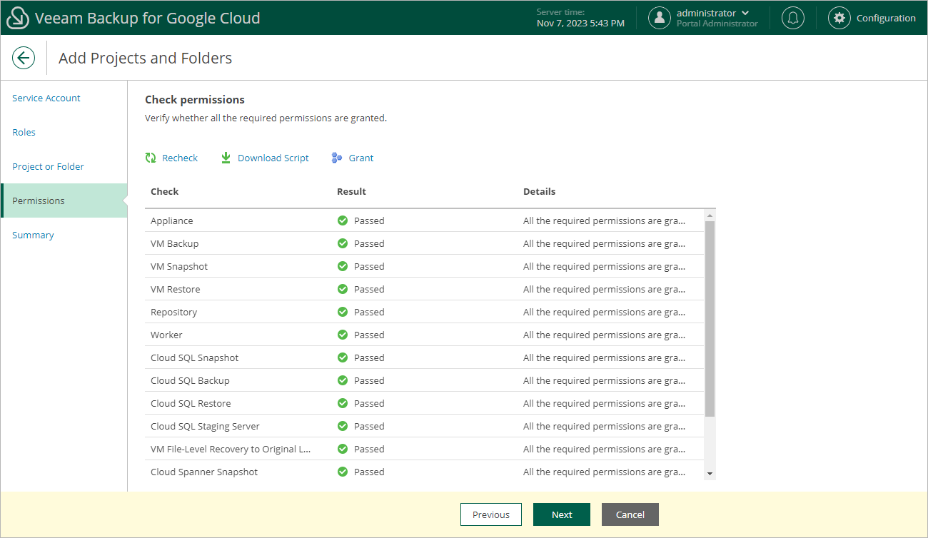 At the Permissions step of the wizard, Veeam Backup for Google Cloud will verify whether the specified service account has all the permissions required to perform the defined operations in the selected project or folder. For more information on the required permissions, see Service Account Permissions.