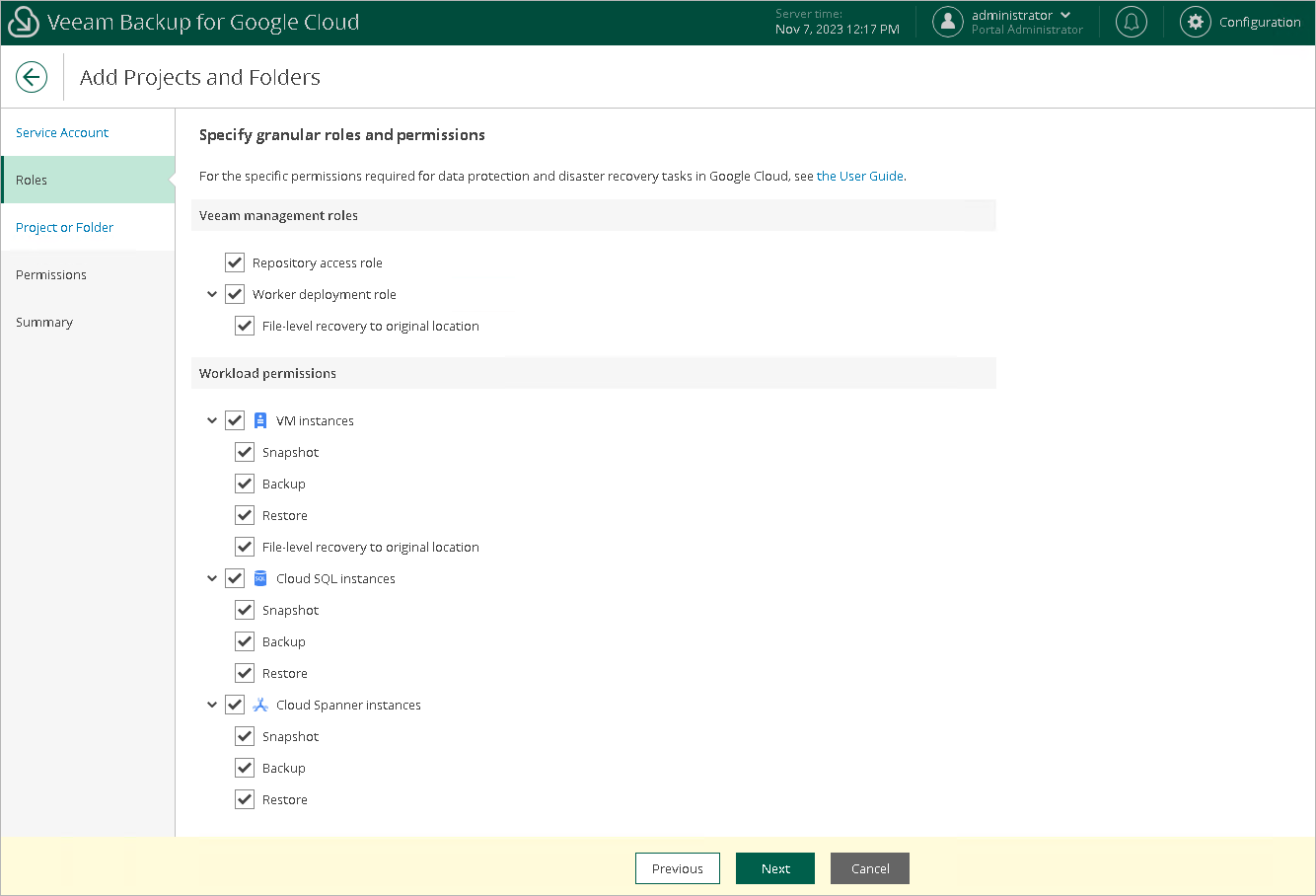 At the Roles step of the wizard, define operations that Veeam Backup for Google Cloud will be able to perform for the resources managed by the project or folder: choose whether Veeam Backup for Google Cloud will be able to protect VM, Cloud SQL and Cloud Spanner instances that belong to this project or folder using cloud-native snapshots and image-level backups, to deploy backup repositories and workers in the project or folder, and to restore VM and Cloud SQL and Cloud Spanner instances to this project or folder from the created backups and snapshots.