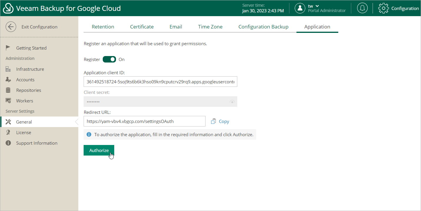 - Back to the Veeam Backup for Google Cloud UI, on the Application tab, provide the Client ID and Client secret used to authorize access to the configured OAuth consent screen, and then click Authorize.