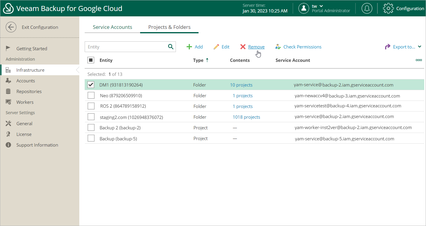 Veeam Backup for Google Cloud allows you to permanently remove a project or folder from the configuration database if you no longer need it: