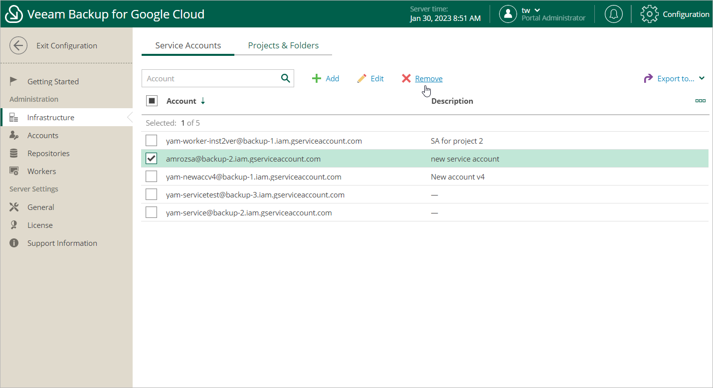 Veeam Backup for Google Cloud allows you to permanently remove a service account from the configuration database if you no longer need it: