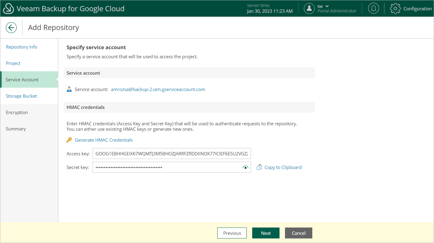 - In the HMAC credentials section, use the Access key and Secret key fields to provide a Hash-based Message Authentication Code (HMAC) key associated with the account — Veeam Backup for Google Cloud will use the HMAC key to authenticate requests to the backup repository.