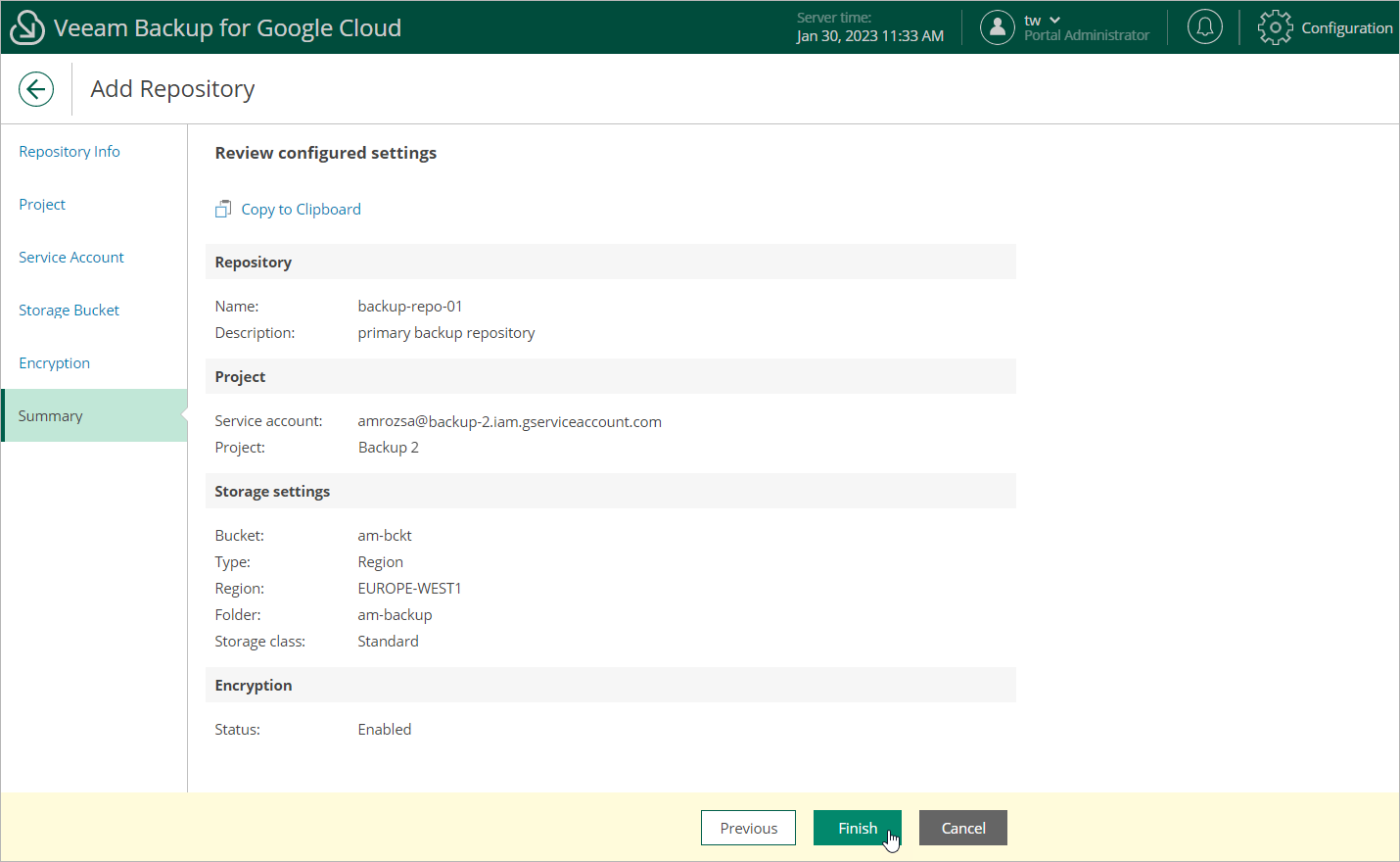 As soon as you click Finish, Veeam Backup for Google Cloud will start creating the new backup repository. To track the progress, click Go to Sessions in the Session Info window to proceed to the Session Logs page.