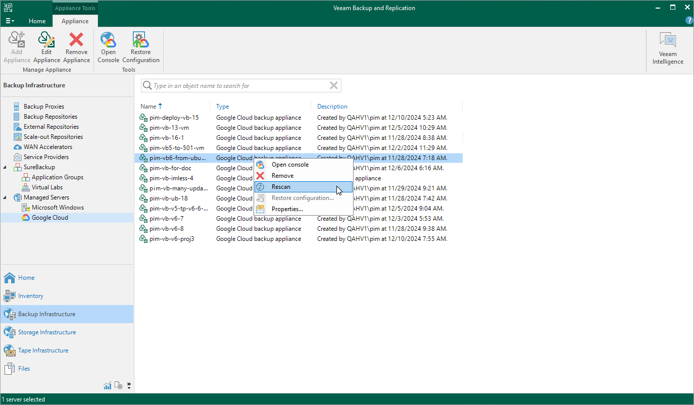 - Select the necessary backup appliance and click Rescan appliance on the ribbon.