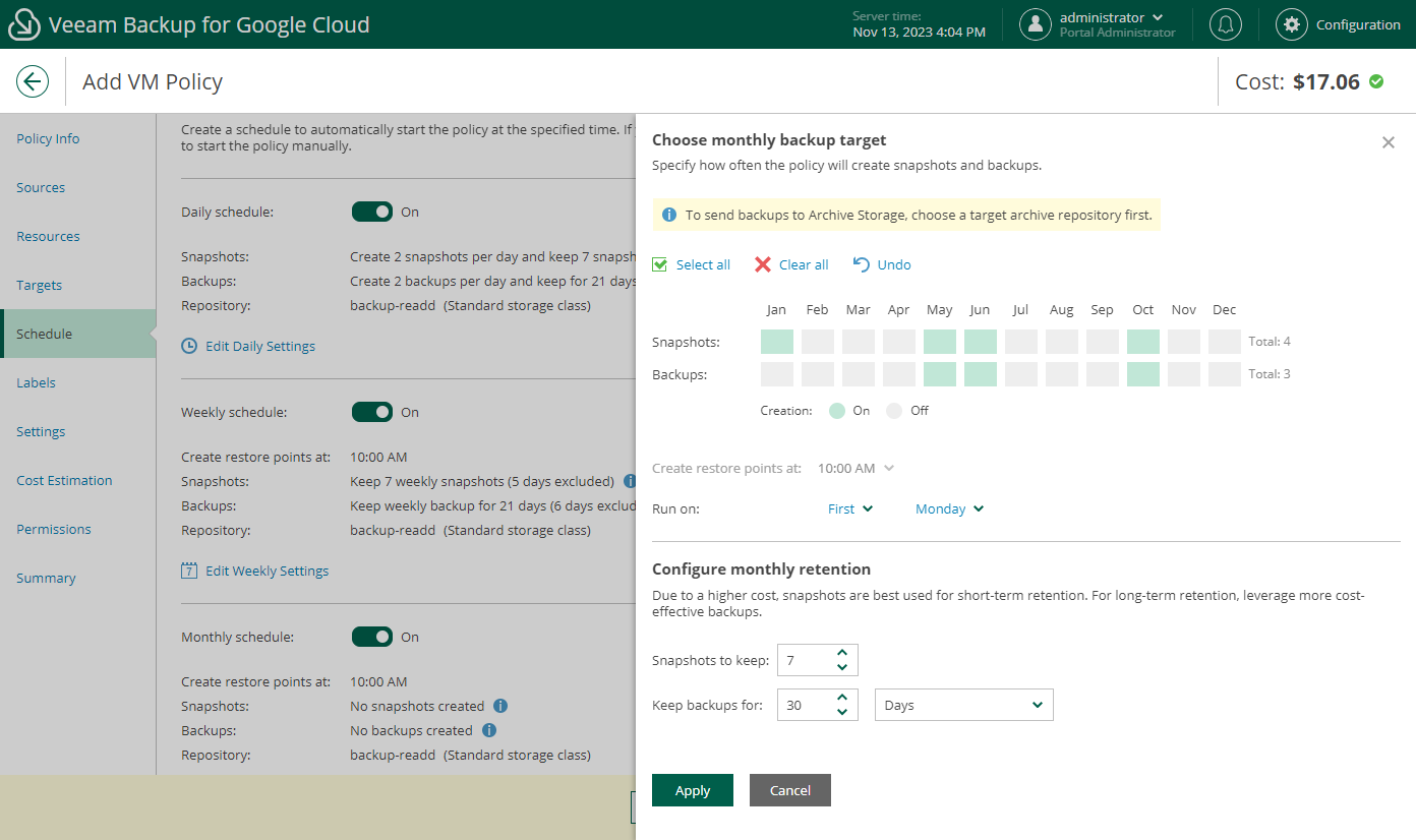 - In the Choose monthly backup target section, select months when the backup policy will create cloud-native snapshots and image-level backups. Use the Create restore points at and Run on drop-down lists to schedule a specific time and day for the backup policy to run.