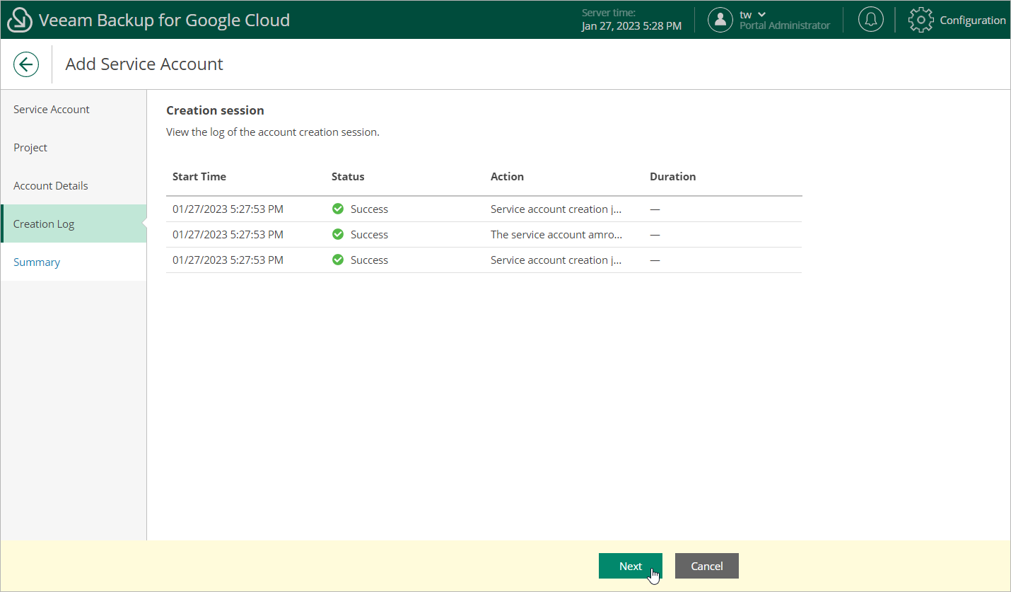 Veeam Backup for Google Cloud will display the results of every step performed while creating the service account. At the Creation Log step of the wizard, wait for the creation process to complete and click Next.