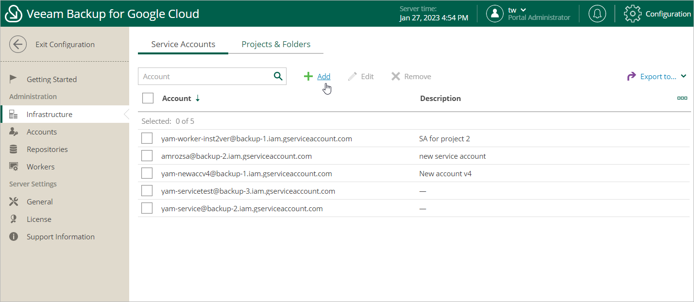 This is an archive version of the document. To get the most up-to-date information, see the current version. Step 1. Launch Add Service Account Wizard To launch the Add Service Account wizard, do the following:Switch to the Configuration page.Navigate to Infrastructure > Service Accounts.Click Add.