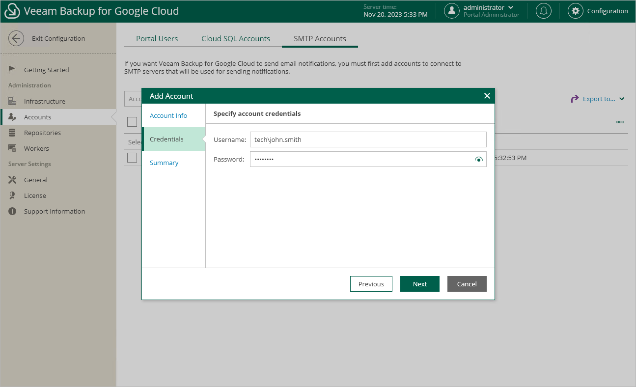 This is an archive version of the document. To get the most up-to-date information, see the current version. Step 3. Provide Credentials At the Account step of the wizard, specify credentials of a user account that will be used to authenticate against the SMTP server.
