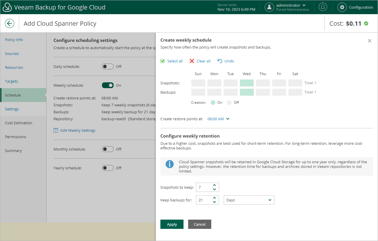 - In the weekly scheduling settings, you select hours and days when backups will be created (for example, 8:00 AM, Wednesday), and specify a number of days for which Veeam Backup for Google Cloud will retain backups (for example, 21 days).