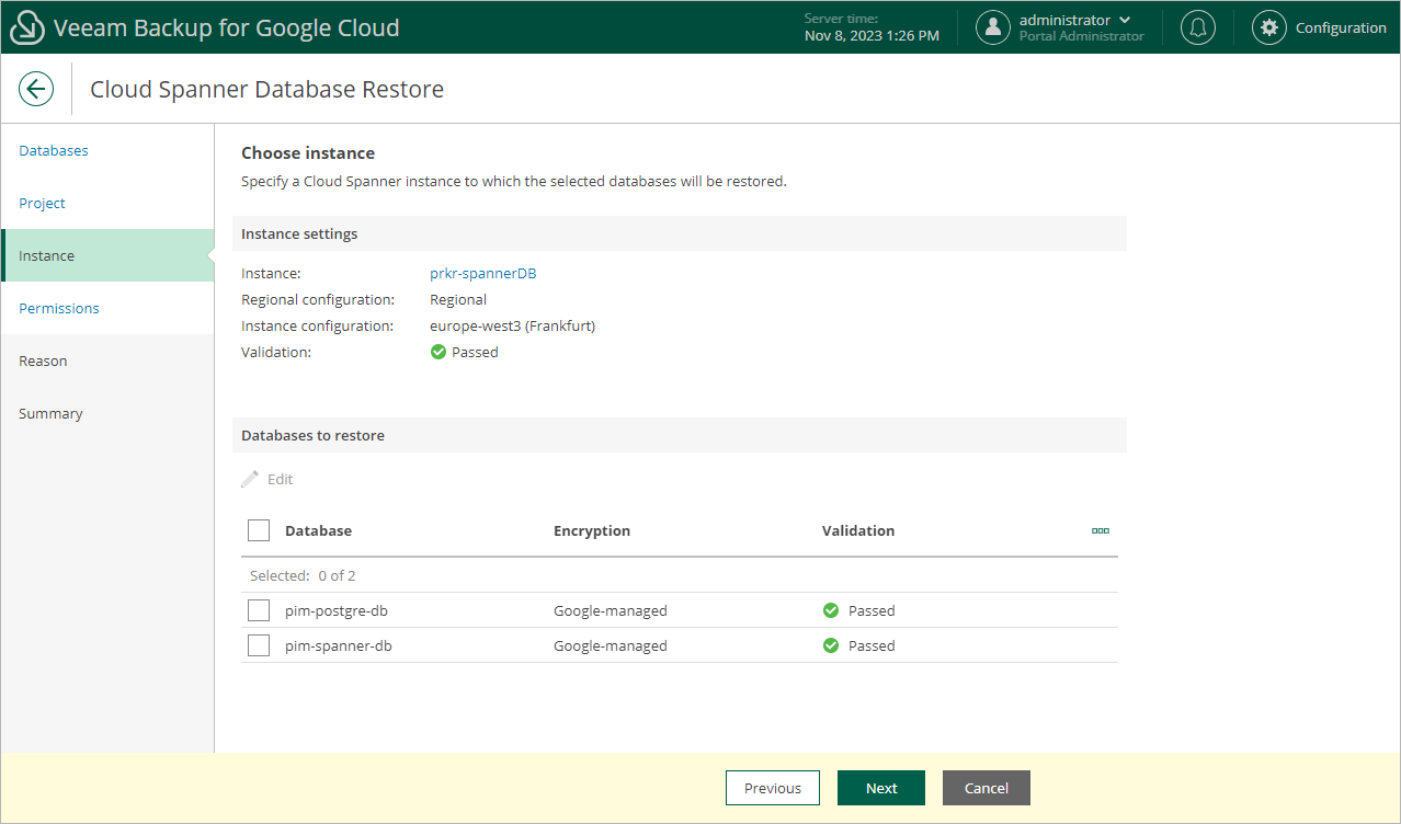 Veeam Backup for Google Cloud will perform a number of configuration checks for the selected instance and databases: