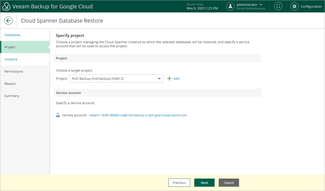 For a service account to be displayed in the list of available accounts, it must be added to Veeam Backup for Google Cloud as described in section Adding Service Accounts, and must be assigned the Cloud Spanner Instances Restore operational role as described in section Adding Projects and Folders.
