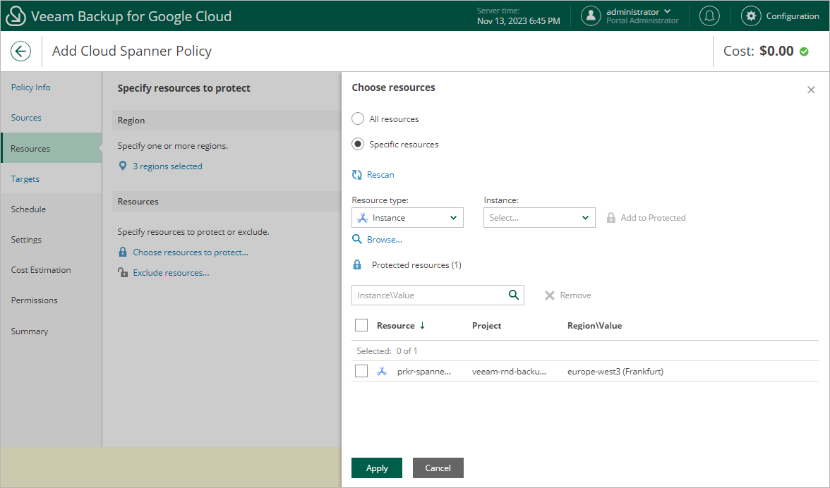 If you add a label to the backup scope, Veeam Backup for Google Cloud will regularly check for new Cloud Spanner instances assigned the added label and automatically update the backup policy settings to include these instances in the scope. However, this applies only to Cloud Spanner instances from the regions selected at step 4a. If you select a label assigned to Cloud Spanner instances from other regions, these instances will not be protected by the backup policy. To work around the issue, either go back to step 4a and add the missing regions, or create a new backup policy.