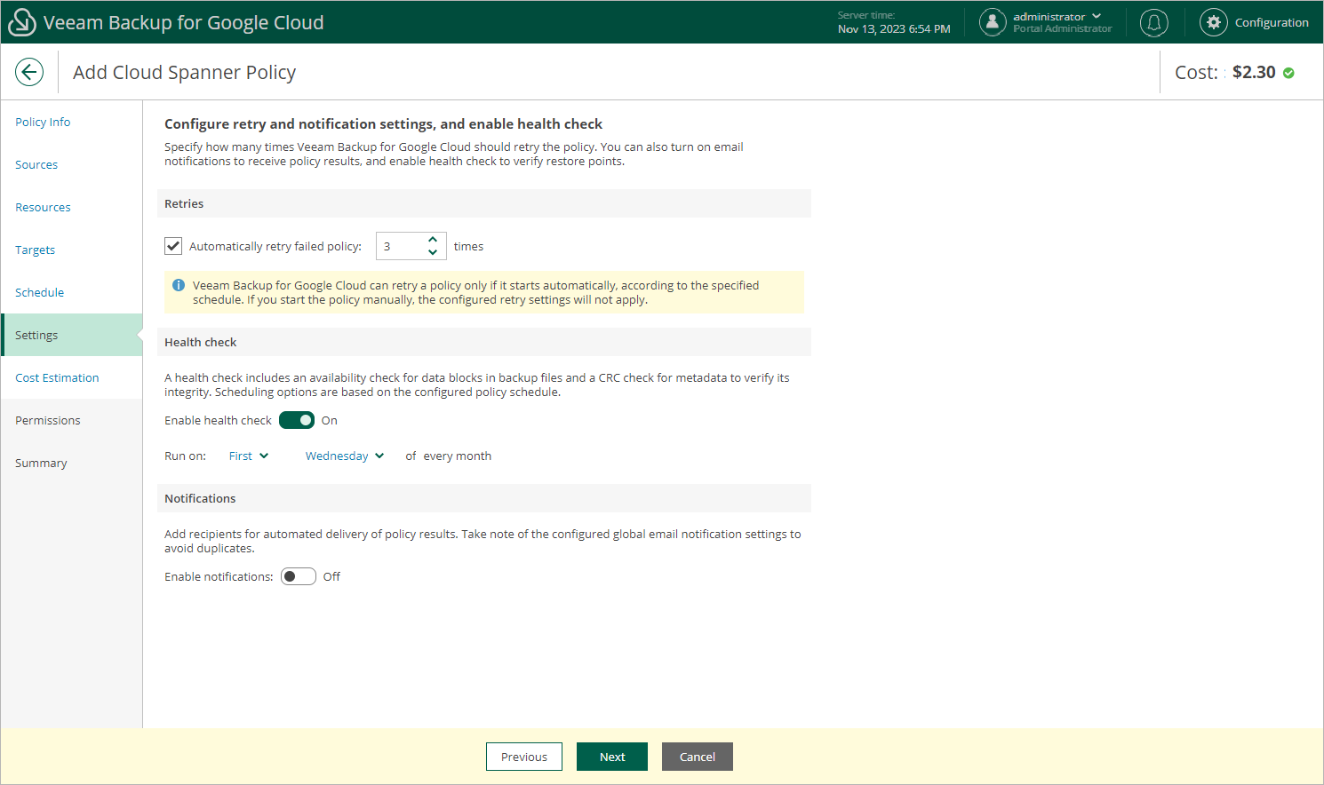 At the Settings step of the wizard, you can enable automatic retries, schedule health checks and specify notification settings for the backup policy.