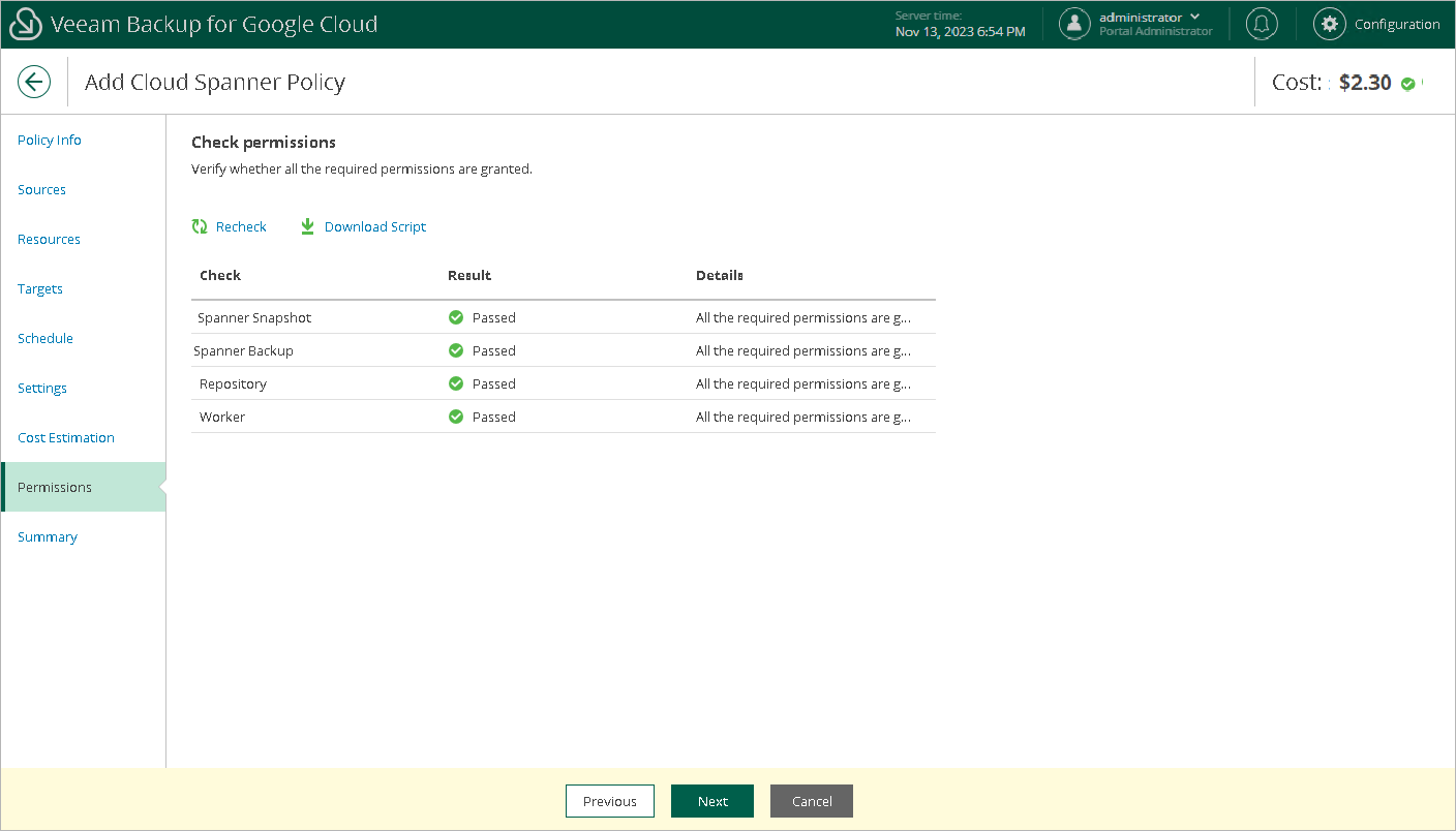 At the Permissions step of the wizard, Veeam Backup for Google Cloud will verify whether the specified service account has all the necessary permissions required to perform data protection tasks for the selected project or folder. For more information on the required permissions, see Service Account Permissions.