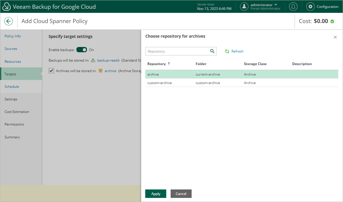 By default, backup policies create only cloud-native snapshots of processed instances. At the Targets step of the wizard, you can instruct Veeam Backup for Google Cloud to create image-level backups of the selected Cloud Spanner instances:
