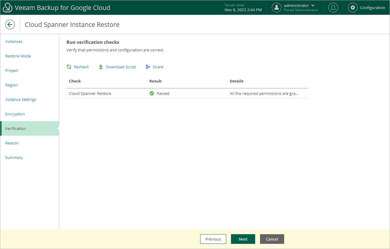 At the Verification step of the wizard, Veeam Backup for Google Cloud will verify whether restore settings are configured properly and the specified service account has all the necessary permissions required to perform recovery tasks for the project that will manage the restored Cloud Spanner instance. For more information on the required permissions, see Service Account Permissions.