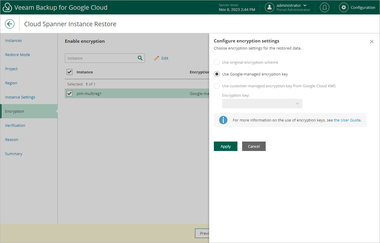 - If you want to encrypt the restored data with a CMEK, select the Use customer-managed encryption key from Google Cloud KMS option and choose the necessary CMEK from the Encryption key drop-down list.