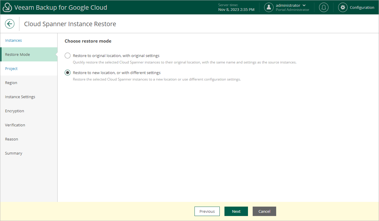 At the Restore Mode step of the wizard, choose whether you want to restore the selected Cloud Spanner instance to the original or to a new location.