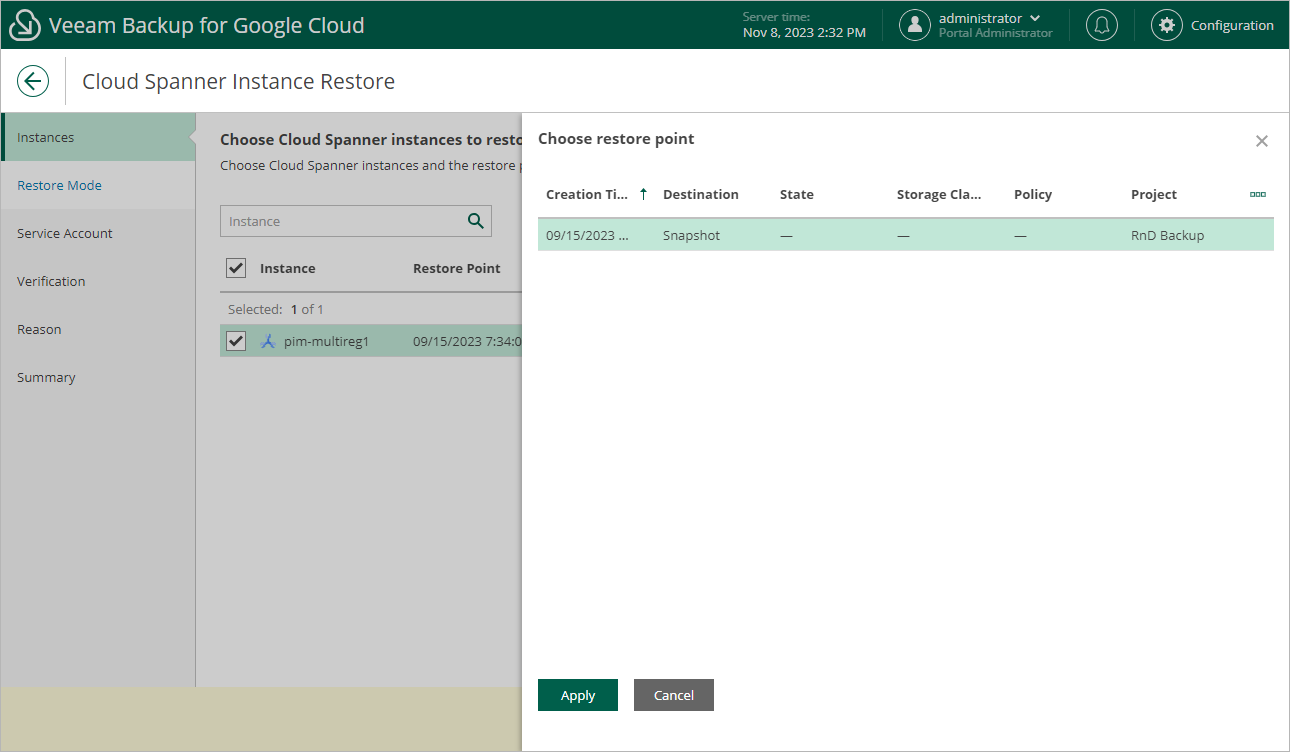 At the Instances step of the wizard, select a restore point that will be used to restore the selected Cloud Spanner instance. By default, Veeam Backup for Google Cloud uses the most recent valid restore point. However, you can restore the instance data to an earlier state.