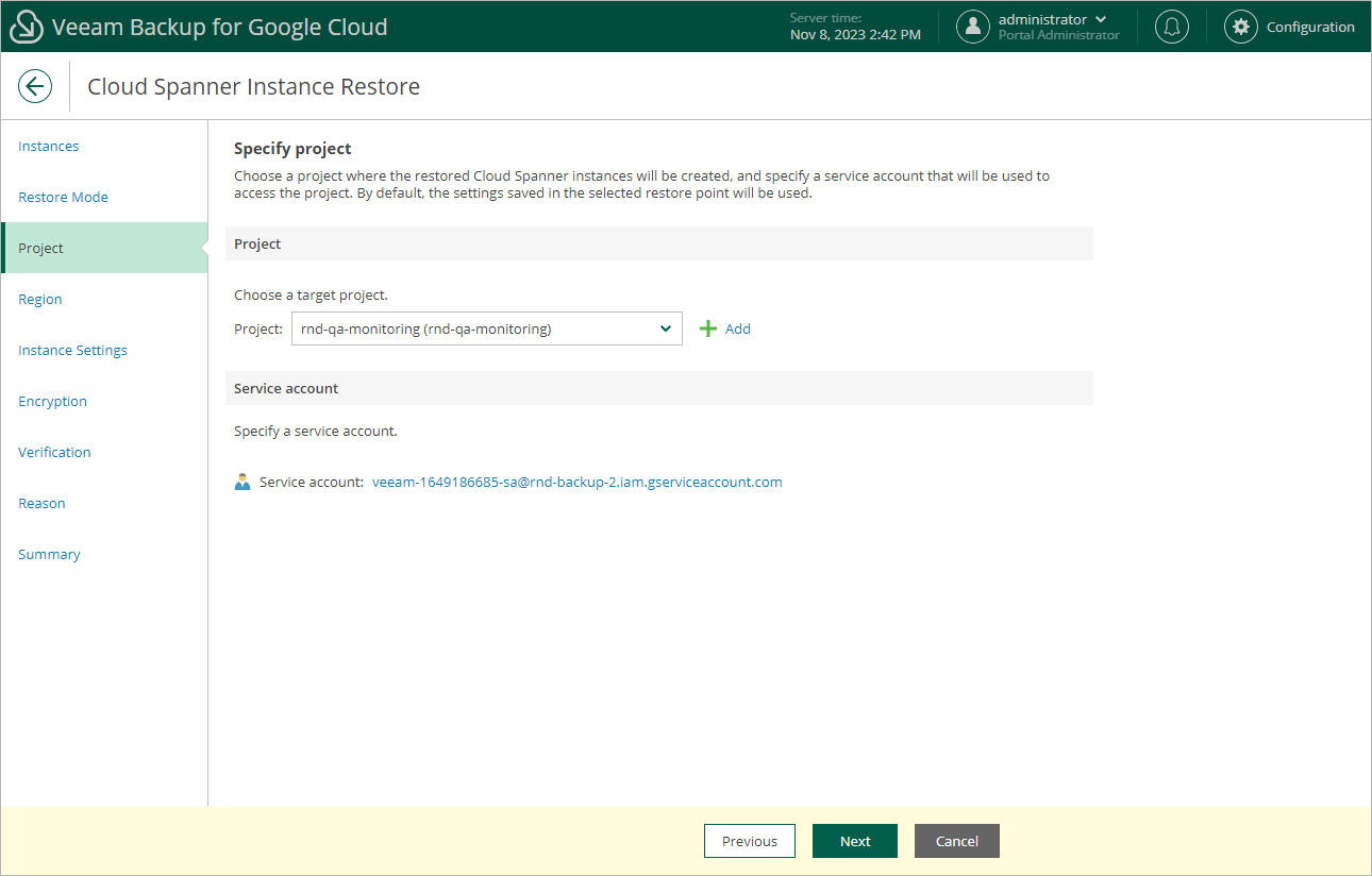 For a project to be displayed in the Project drop-down list, it must be added to Veeam Backup for Google Cloud as described in section Adding Projects and Folders. If you have not added the necessary project to Veeam Backup for Google Cloud beforehand, you can do it without closing the Cloud Spanner Instance Restore wizard. To do that, click Add and complete the Add Projects and Folders wizard.