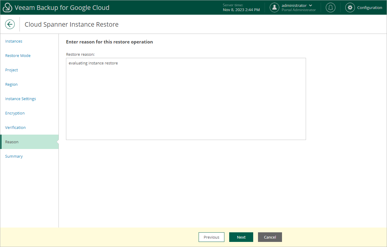 At the Reason step of the wizard, specify a reason for restoring the Cloud Spanner instance. This information will be saved to the session history, and you will be able to reference it later.