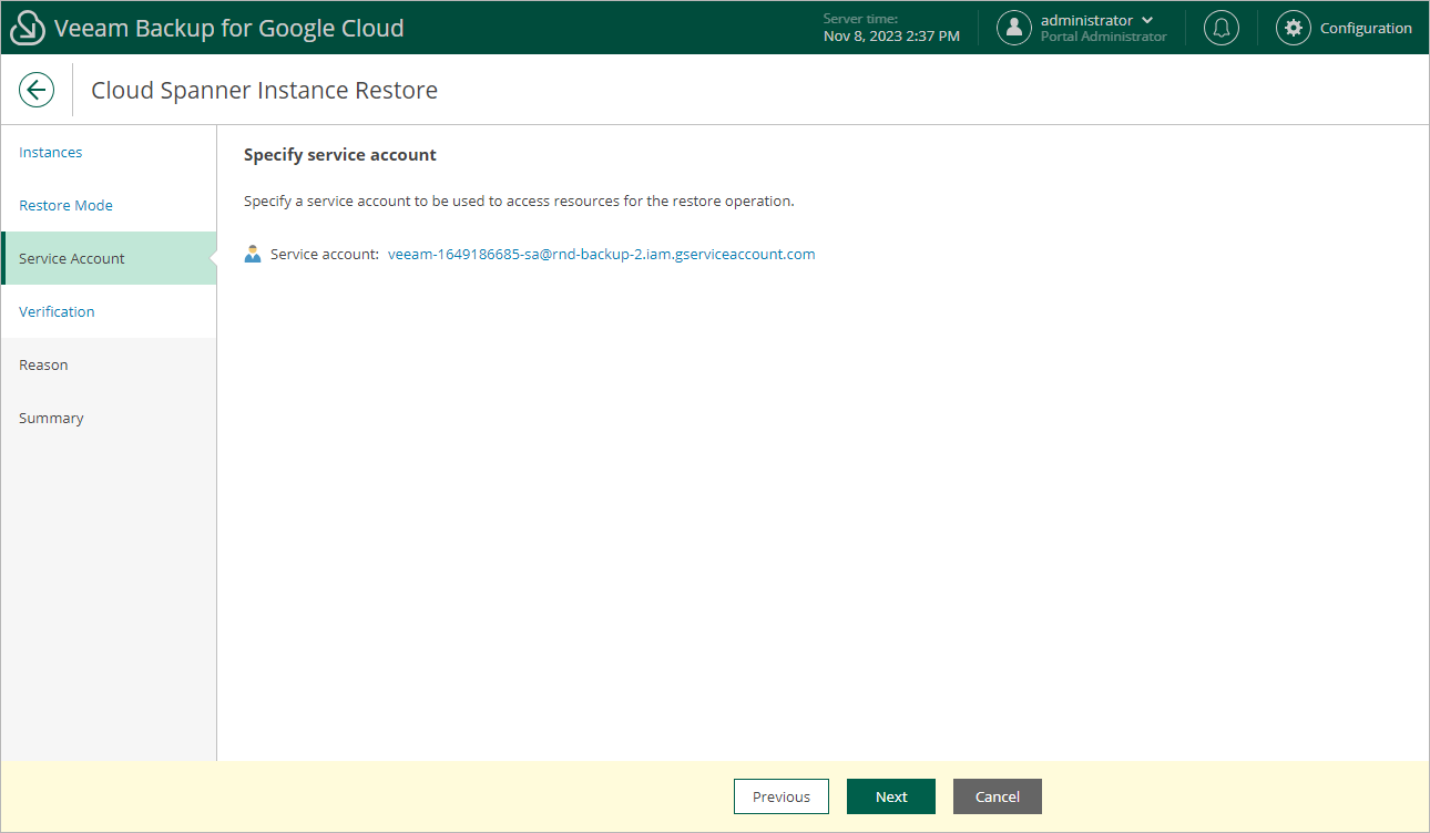 For a service account to be displayed in the Service account drop-down list, it must be added to Veeam Backup for Google Cloud as described in section Adding Service Accounts, and must be assigned the Cloud Spanner Instances Restore operational role as described in section Adding Projects and Folders.