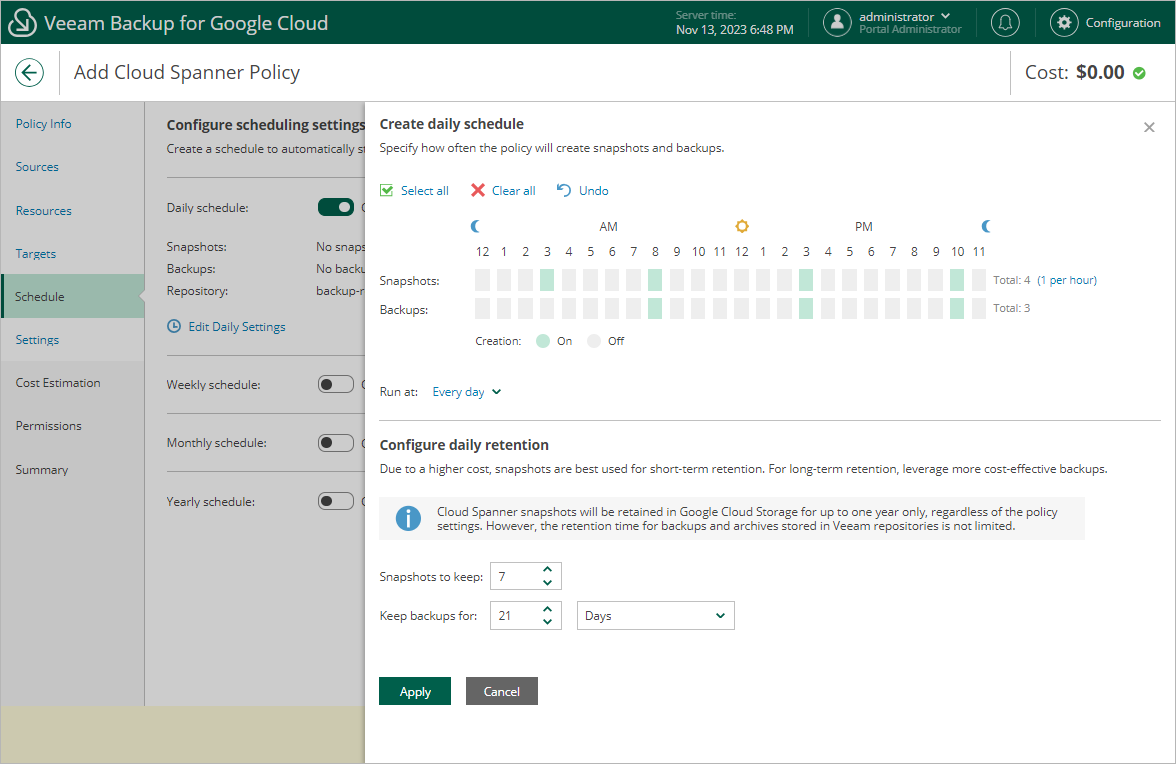 - In the Create daily schedule section, select hours when the backup policy will create cloud-native snapshots and image-level backups. Use the Run at drop-down list to choose whether you want the backup policy to run every day, on weekdays (Monday through Friday) or on specific days.