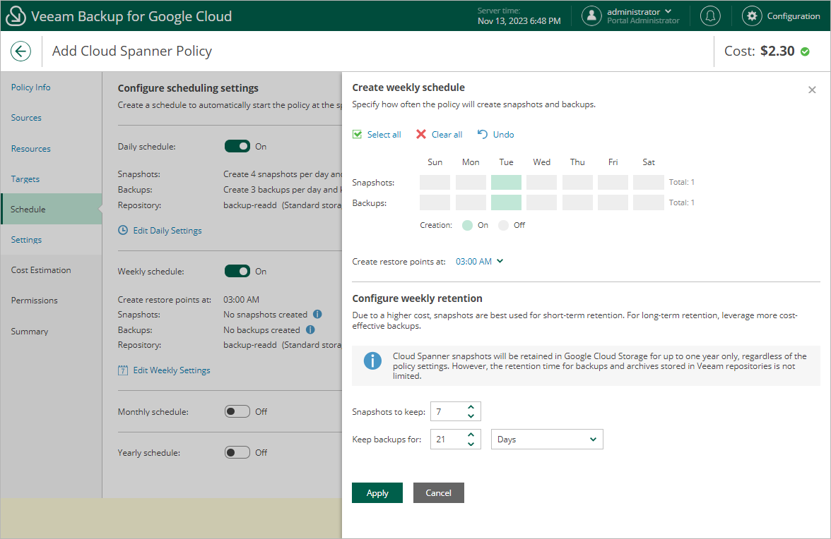 Veeam Backup for Google Cloud does not create image-level backups independently from cloud-native snapshots. That is why when you select days for image-level backups, the same days are automatically selected for cloud-native snapshots. To learn how Veeam Backup for Google Cloud performs backup, see Spanner Backup. |