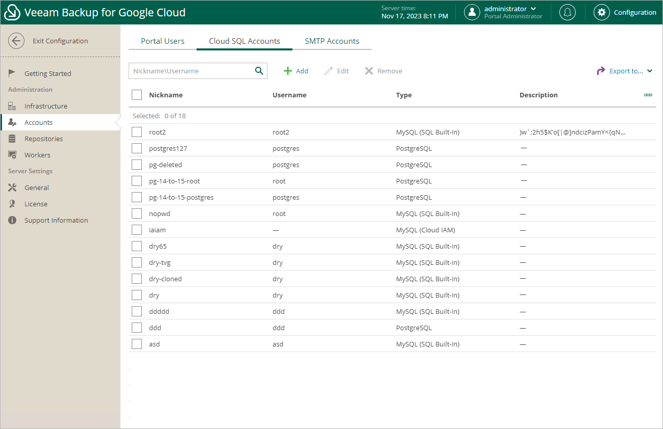 This is an archive version of the document. To get the most up-to-date information, see the current version. Step 1. Launch Add Account Wizard To launch the Add Account wizard, do the following:Switch to the Configuration page.Navigate to Accounts > Cloud SQL Accounts.Click Add.