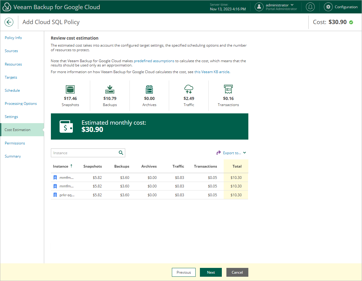 For each Cloud SQL instance included in the backup policy, Veeam Backup for Google Cloud takes into account the amount of storage provisioned for the instance, thethe period of time during which restore points will be kept in the archive backup chain, and the configured scheduling settings.