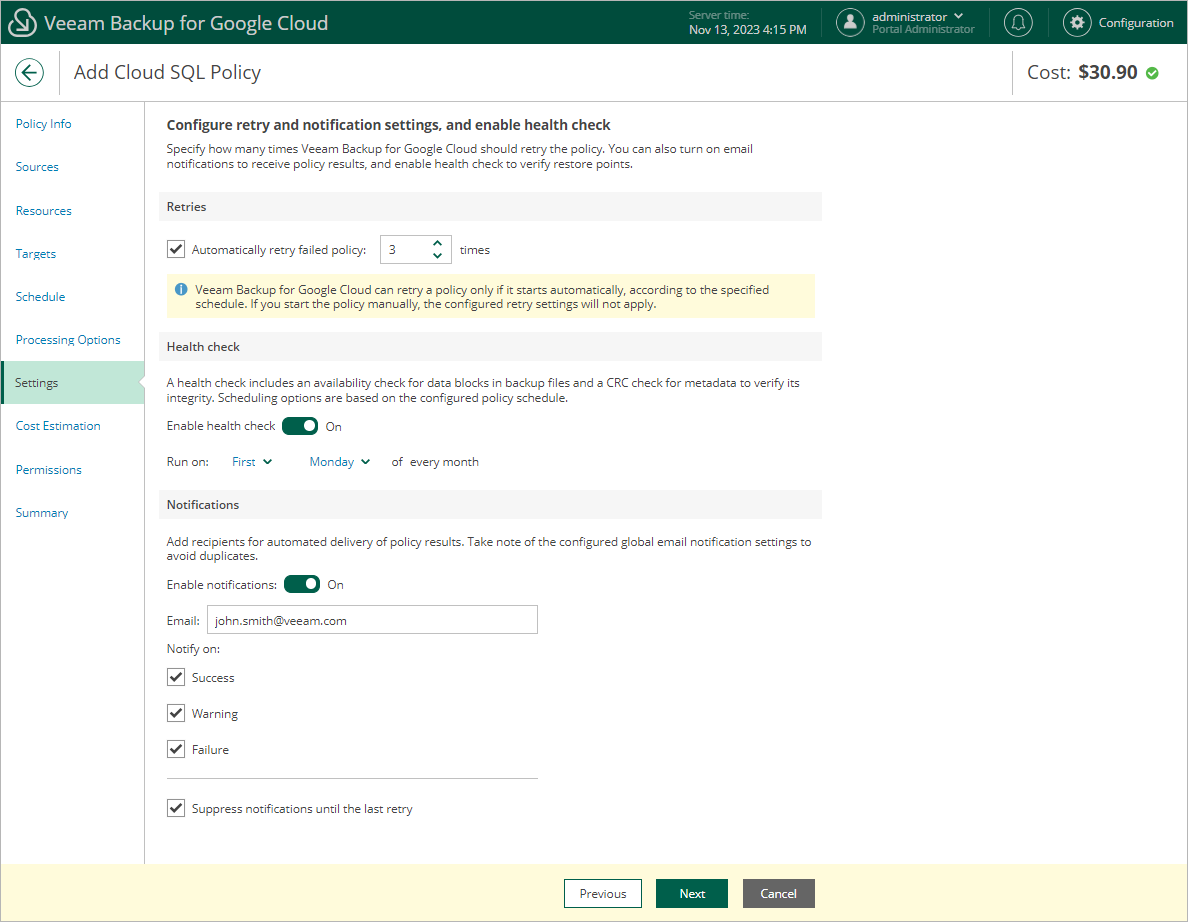 At the Settings step of the wizard, you can enable automatic retries, schedule health checks and specify notification settings for the backup policy.