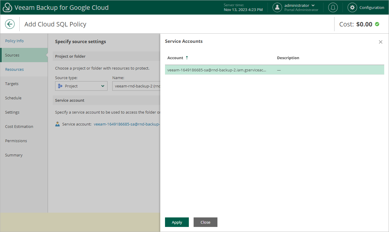 For a service account to be displayed in the list of available accounts, it must be added to Veeam Backup for Google Cloud as described in section Adding Service Accounts, and must be assigned the Cloud SQL Instances Snapshot and Backup operational roles as described in section Adding Projects and Folders.