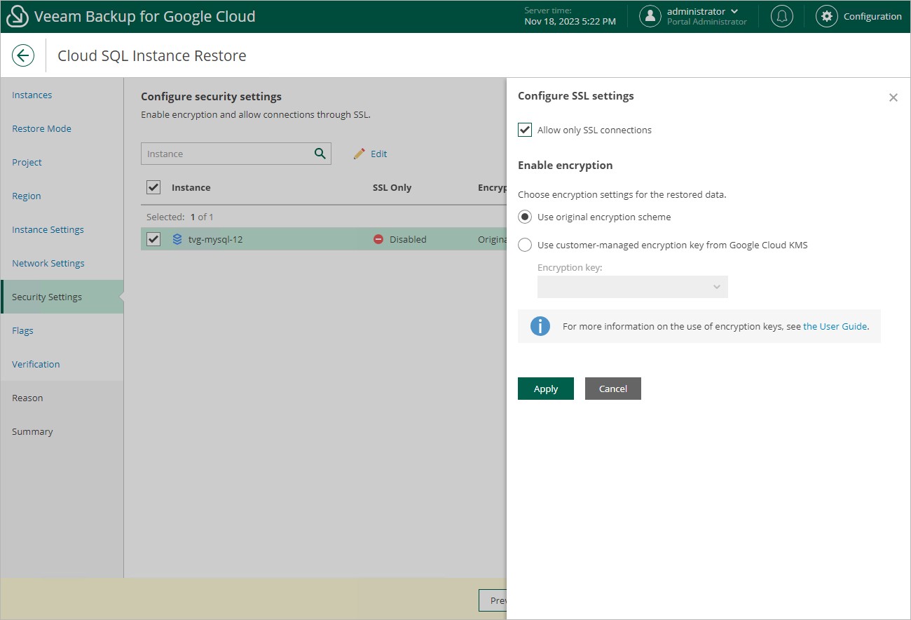 - In the opened window, choose whether you want to connect to the restored Cloud SQL instance using SSL only, and whether you want the instance data to be encrypted with a Google Cloud KMS CMEK: