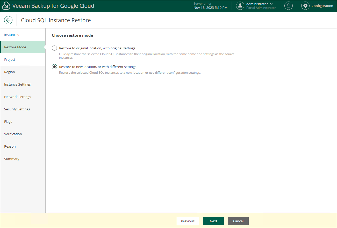 At the Restore Mode step of the wizard, choose whether you want to restore the selected Cloud SQL instance to the original or to a custom location.