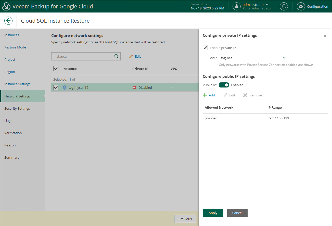 - In the Edit network settings window, choose whether you want to configure public IP and private IP connectivity for the restored Cloud SQL instance: