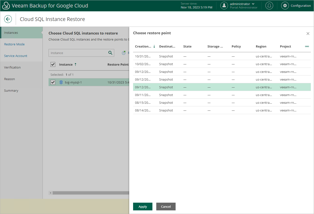 At the Instances step of the wizard, select a restore point that will be used to restore the selected Cloud SQL instance. By default, Veeam Backup for Google Cloud uses the most recent valid restore point. However, you can restore the instance data to an earlier state.