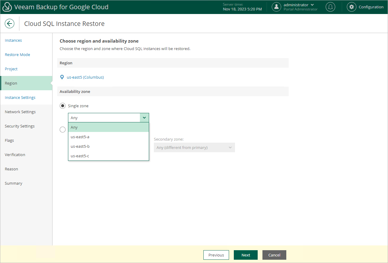 At the Region step of the wizard, select a region where the restored Cloud SQL instance will operate and an availability zone for which you want to configure network settings.
