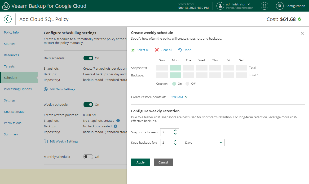 - In the Create weekly schedule section, select days when the backup policy will create cloud-native snapshots and image-level backups. Use the Create restore points at drop-down list to schedule a specific time for the backup policy to run.