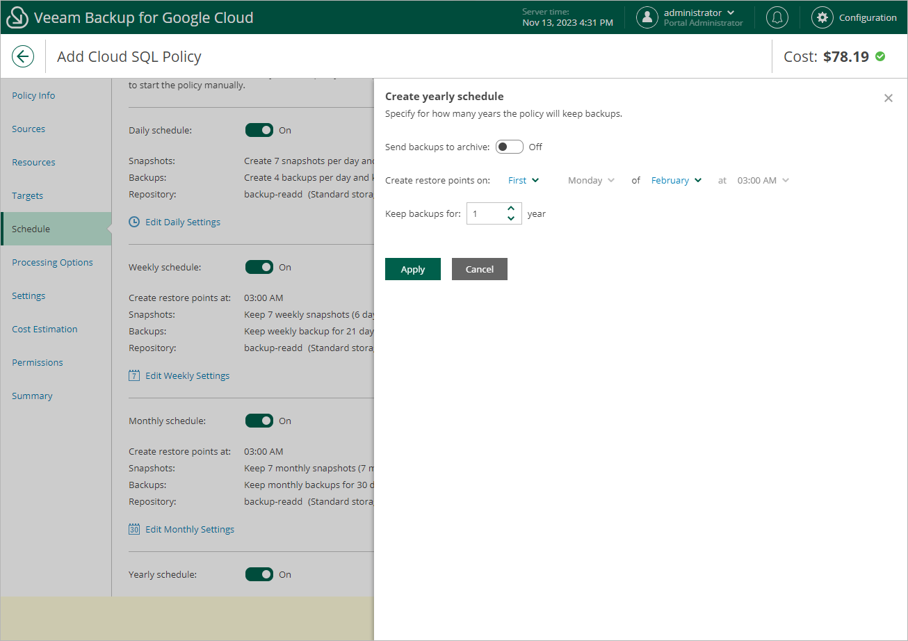 To create a yearly schedule for the backup policy, at the Schedule step of the wizard, do the following: