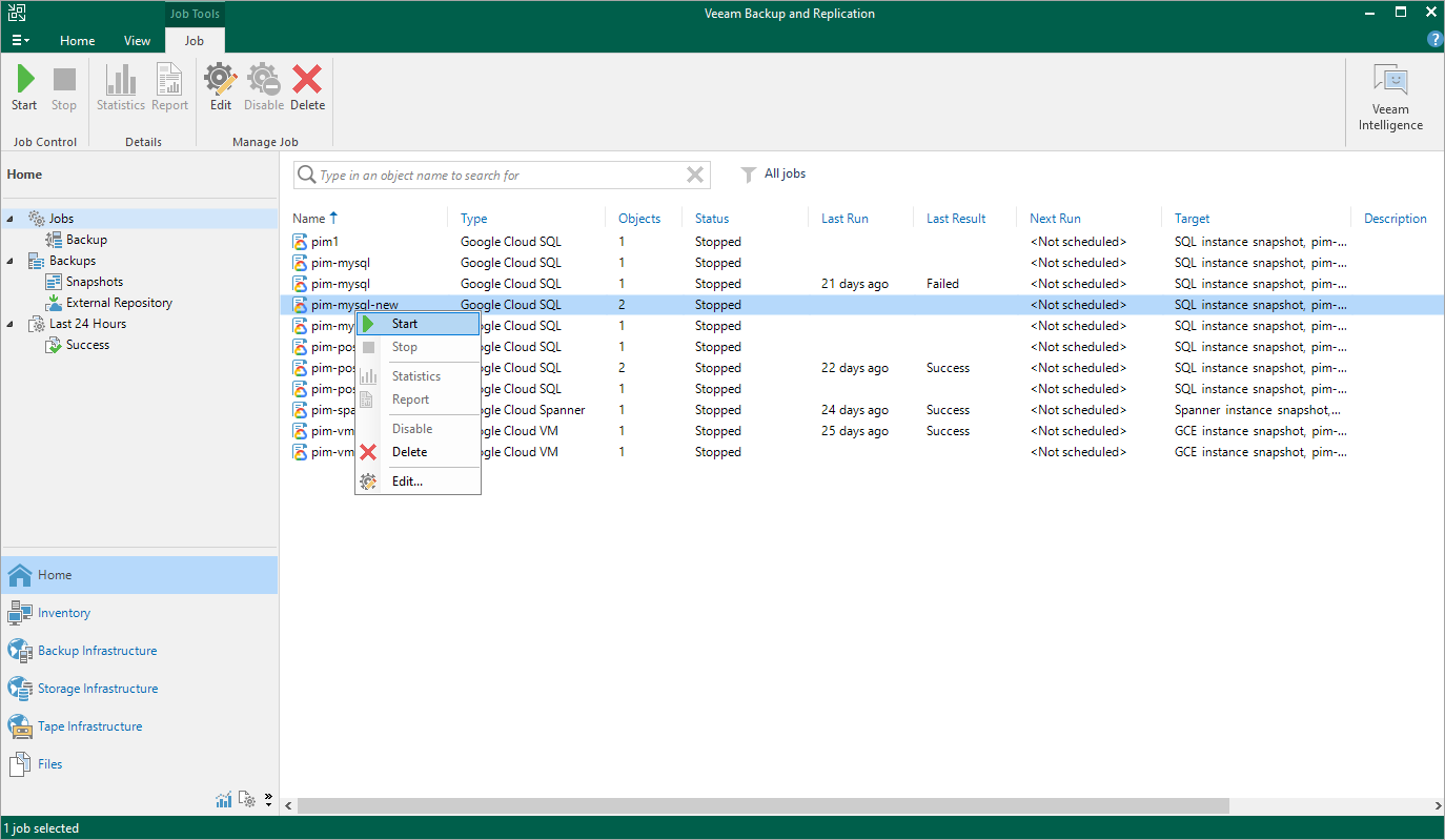 - Select the necessary backup policy, and click Start or Stop on the ribbon.