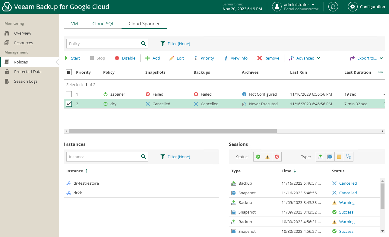 You can start a backup policy manually, for example, if you want to create an additional restore point in the snapshot or backup chain and do not want to modify the configured backup policy schedule. You can also stop a backup policy if processing of an instance is about to take too long, and you do not want the policy to have an impact on the production environment during business hours.